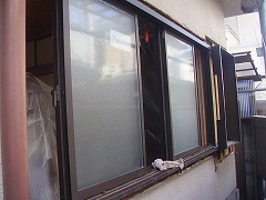 既設の古い木製サッシからアルミサッシの入れ替え作業状況です。