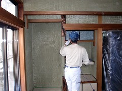 昨日に引続きジュラク壁の下地作業を行いました。 下地でジュラクの仕上がりが決まるので丁寧に作業をしていました。