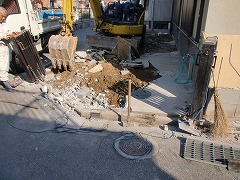 本日より外構工事作業開始です。写真は既設の塀等の解体作業状況です。