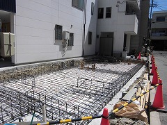 外部犬走り部分にワイヤーメッシュ敷き作業状況です。