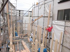 この現場は1階の土間が床になるので正確に配管を仕込む為通りを出している状況です。