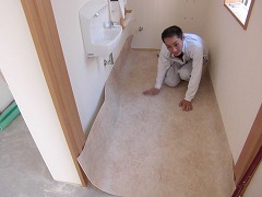 石膏ボードの継目にパテにて下地処理をしている作業状況です。